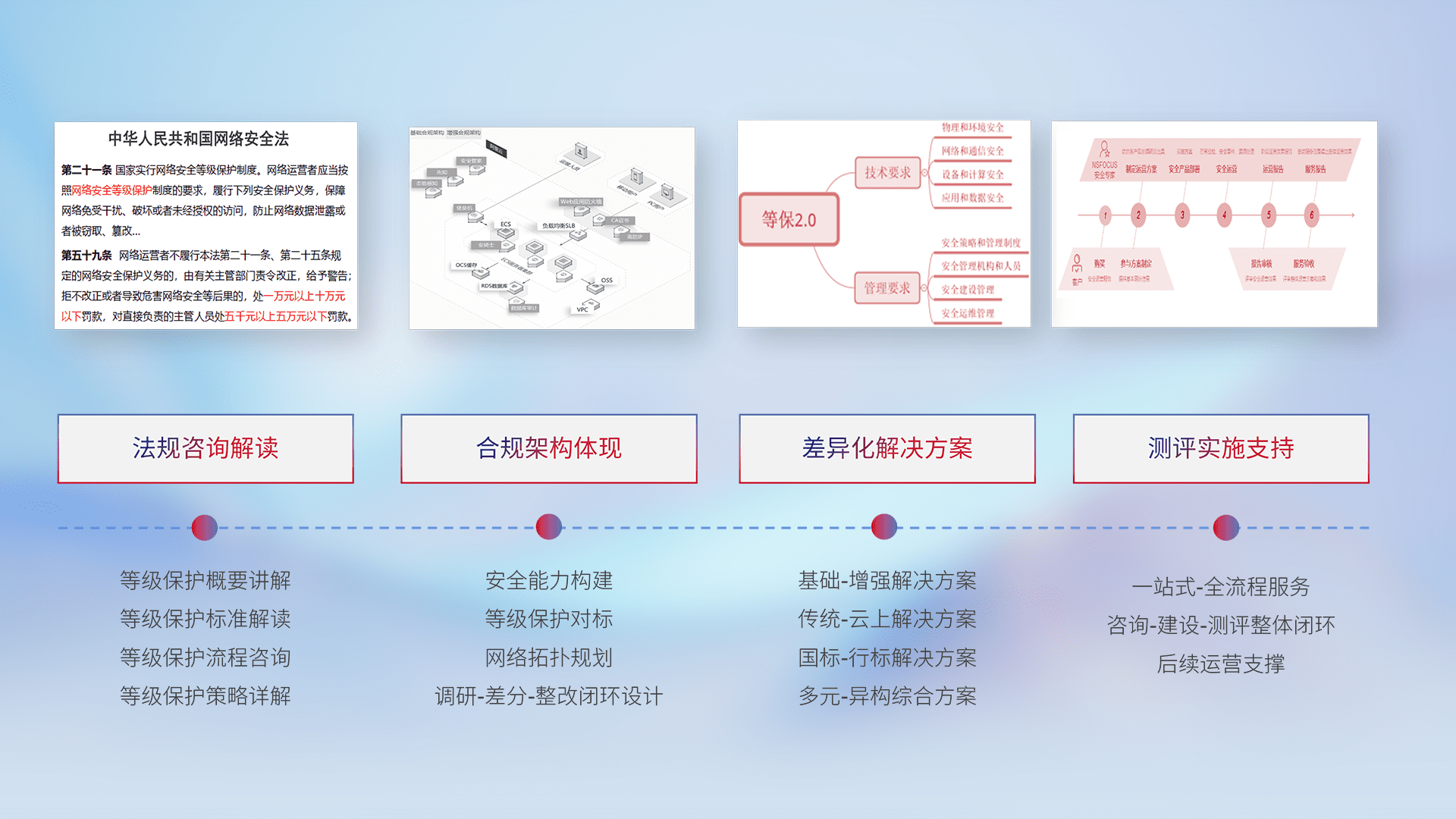 通过专业的法律咨询解读、、合规架构体现、、、、差异化解决方案、、、测试实施支持等服务,,,,为客户量身打造等保合规体系。。。。